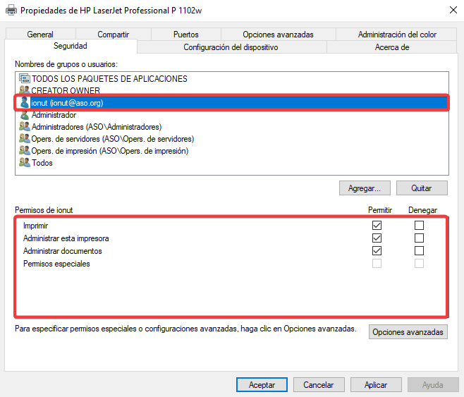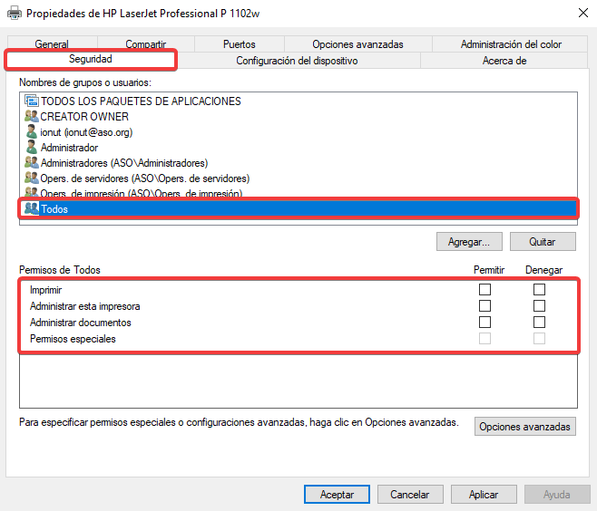 Luego, nos aseguraremos de cambiar los permisos de la impresora para que no todos tengan permitido imprimir.