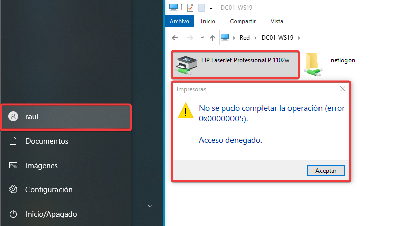 Al acceder con un usuario sin permisos, no veremos ninguna impresora, solo el panel de control.