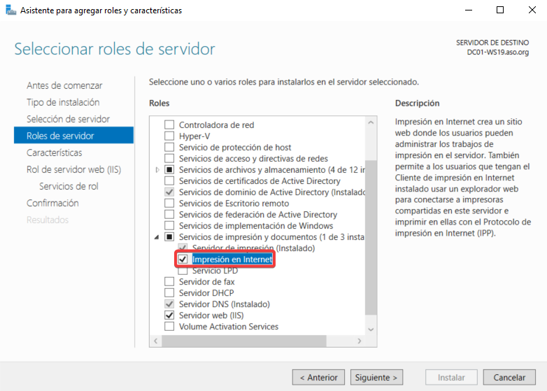 Seleccionamos el rol de Servicios de impresión y documentos.